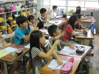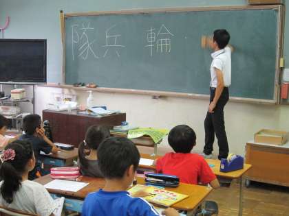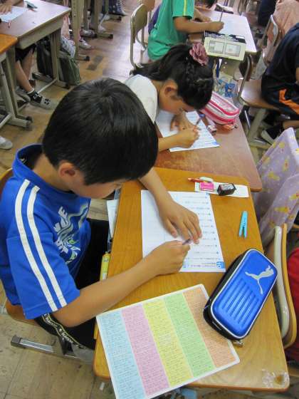 4年2組では,漢字の小テストの前に復習をしていました。黒板に間違いそうな漢字を書き,間違いやすいところを確かめていました。そのあと,黒板の漢字を消すときにも,書き順通りに消していきました。子どもたちは,消される順が書き順になることを知っているので,指で空書きしながら一緒に復習していました。