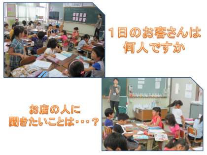 2年2組では,「まちをはっけん 大はっけん!」で,校区にあるお店の方にお願いして見学をさせていただきます。このお店訪問の時に,教えていただくことをグループで話し合い,全体の場で発表していました。