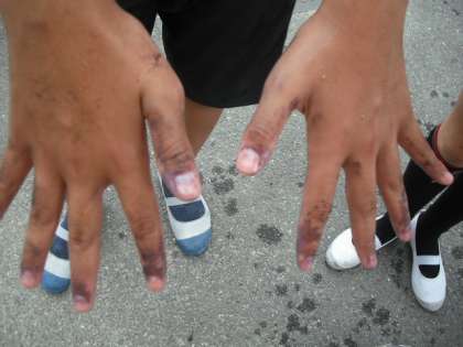 4.手に残ったでんぷん(洗い残し)にヨウ素液が反応して紫に染まる