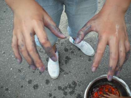 ヨウ素でんぷん反応を利用した実験です。1の段階では,「どろどろして気持ち悪い!」などと言って消極的な子どもたちでしたが,でんぷんを早く乾かすために走り回ったり,手を振り回したりと,とても楽しそうでした。結果は…,悲惨でした。手は見事に染まり,その結果に子どもたちも大興奮!! 実験後の感想では,自分の手洗いを振り返って,自分自身の洗い残し部分が分かったので,しっかり習慣づけたいといった感想が多くありました。