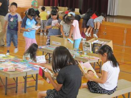 子ども達は,展示されている本を手に取り,どの本を図書室に置いてもらおうかなと熱心に選んでいました。
