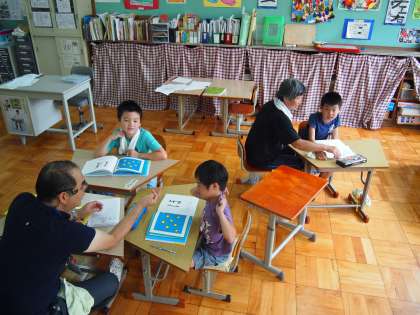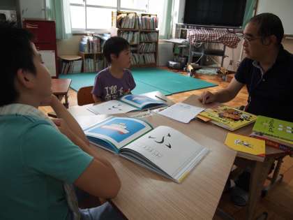 あおぞら学級の国語の時間です。「ふ」「へ」などの文字がつくことばやプリントの学習に取り組んでいました。