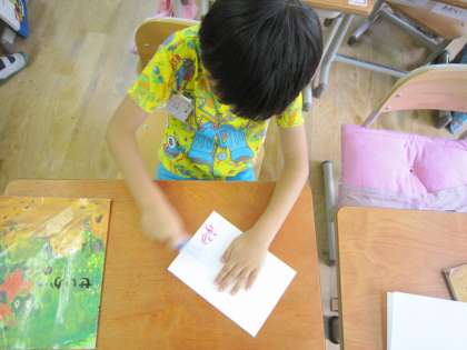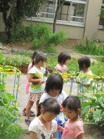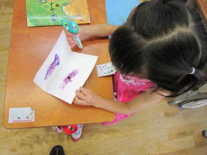 1年生は,アサガオを育てています。大きく育ったアサガオの花をとり,何やら画用紙に挟んで上からはさみでこすっています。