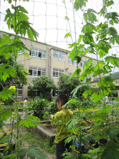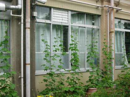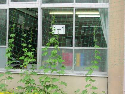 緑のカーテンのゴーヤが,ぐんぐん成長しています。1年生の身長より伸びて,1階の窓の上の方に届きそうになっています。