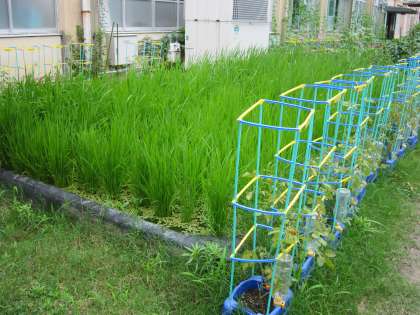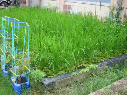 イネもどんどん伸び,隣りに置かれているミニトマトの枠の2つ目くらいまで伸びています。