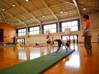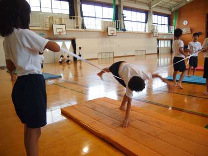 2年1組はマット運動です。低学年のうちに回転することや頭が足よりも下になる経験をたっぷりしておくことが大事ですね。