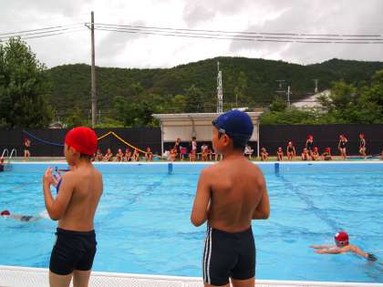 4年生は水泳学習です。「今日は無理かも…」と思っていましたが,気温や水温は大丈夫,雨もほとんど降らない時間帯があったのでラッキーでした。