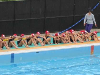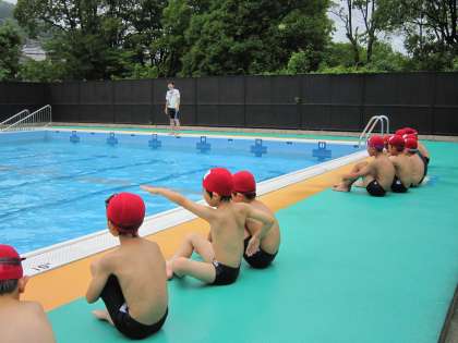 見ていると,クロールの腕の動きや息をするときの顔の動きを説明していました。しっかりとシュミレーションをしてから練習を始めました。