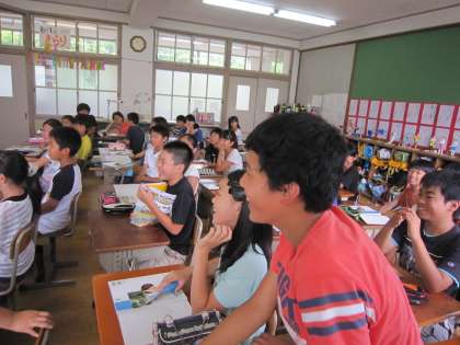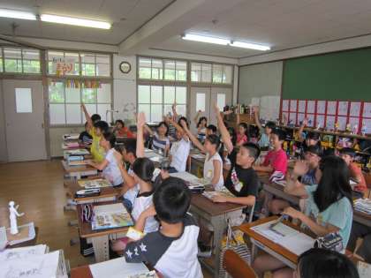 6年1組に入ると,担任の五十川先生より「少しうるさくなってもいいですか。」と聞かれ,「はい」と答えました。一体何が始まるのかとドキドキしていますと,「日本に攻めてきた人々がいます。誰だったでしょうか。」という声が聞こえ,一斉に「はい,はい。」という声とともに手が上がりました。「モンゴルです。」「元です。」では,・・・・・。というように返事の声でにぎやかになることを言われたと気がつきました。元気があっていいなぁと思います。