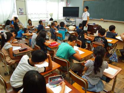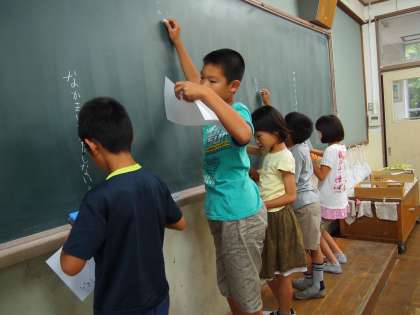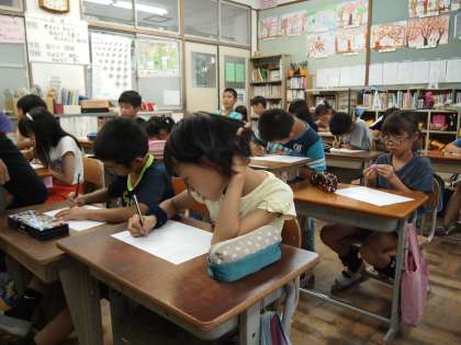 4年2組は道徳の時間です。『外国から来た転校生』というお話を読んで考えるということです。ワークシートに自分の意見を書いていましたが,時間が来たので黒板にそれを書きに行きました。友だちの考えに触れながら自分の思いを深めていけたら素敵ですね。