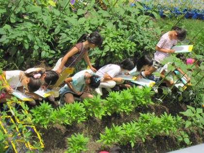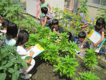 ひまわりやホウセンカの周りに座って,観察です。