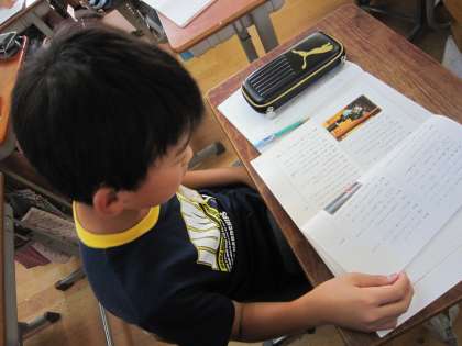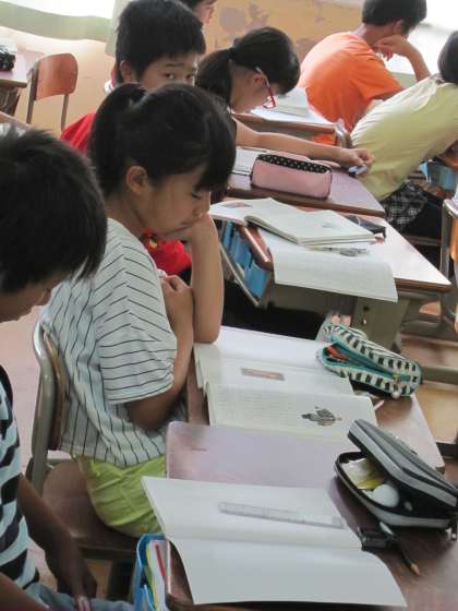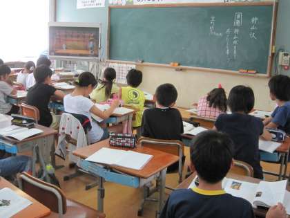 6年1組では,国語の教材になっている「柿山伏」の上演されている様子をVTRで見て,感じたことを話し合っていました。