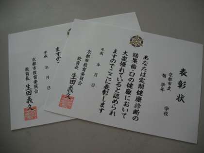 この表彰は,小学6年生と中学3年生が対象になります。春の歯科検診において,むし歯がない,不正咬合・歯列不正がない,歯周疾患がない,口腔清掃が良好,4つの条件を満たしている児童に贈られます。歯科医の先生と23名を選ばせていただきました。