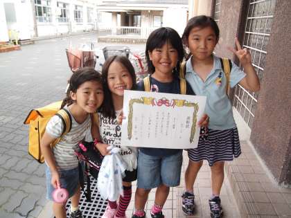 「百冊読書」の賞状をもらったよ。記念にみんなで「ハイ,ポーズ」