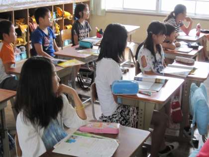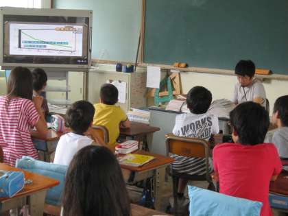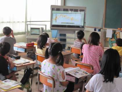 5年2組では,米づくりについて映像資料を見た後,話し合いをしていました。