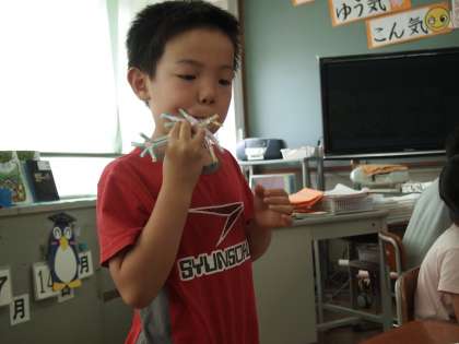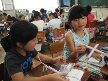 こちらは3年2組。同じく「やさしい…」です。ストローをふいたらミサイルが発射されるというものもありました。