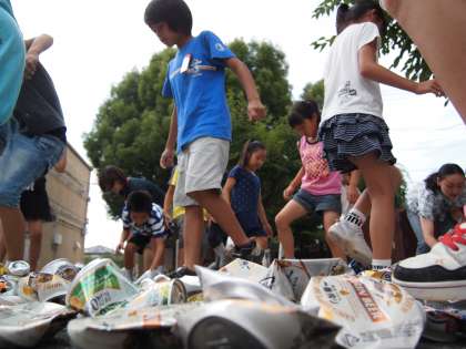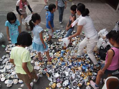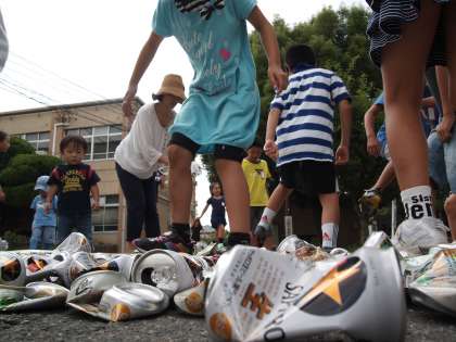 今日も中間休みに3年1組の子どもたちと保護者の方々,PTA本部さんでアルミ缶踏みをして下さいました。