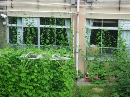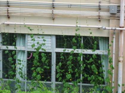 緑のカーテンのゴーヤが,ここ2〜3日でぐんぐん伸びています。今日は,1階の教室をこえ,2階の窓の下近くまで伸びています。