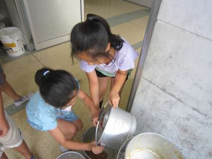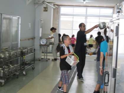 返すのが遅いクラスは,食缶に残菜が残っていることがあります。