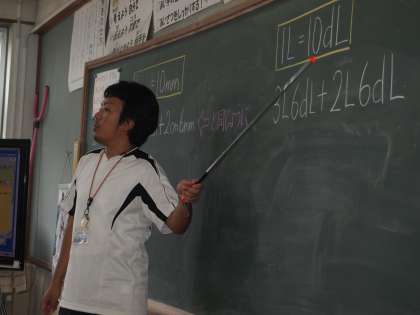 2年1組です。「1cmは何mmか」「1lは何dlか」など考えながら問題を解いているようでした。