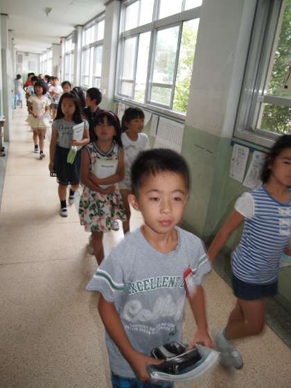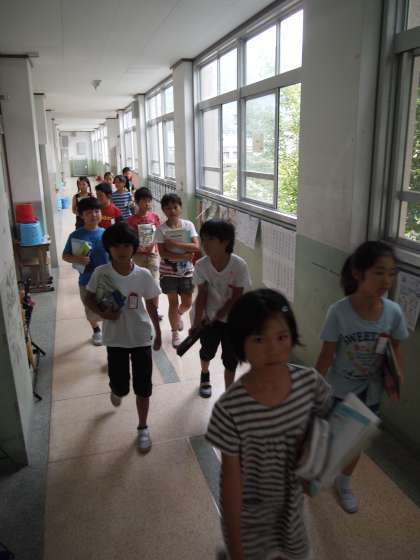 3年1組の子どもたちが授業中に廊下を歩いて移動していました。誰もしゃべらず走らずに落ち着いて歩いています。感心しました。