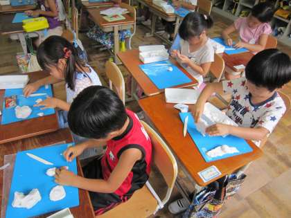 1年2組では,「ねんどですきな キャラクターをつくろう」というテーマで,作品作りに取り組んでいました。