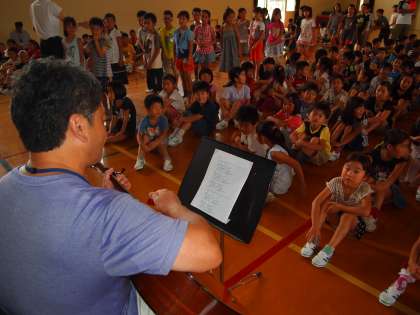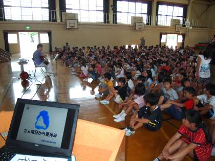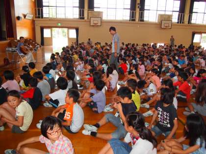朝会が始まる前,みんなが体育館に入ってきたときに稲本先生の歌がギターの調べに乗って聞こえてきました。曲は吉田拓郎の「麦わら帽子はもう消えた…」で始まる名曲『夏休み』。
