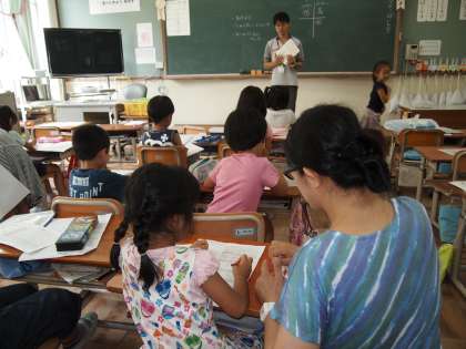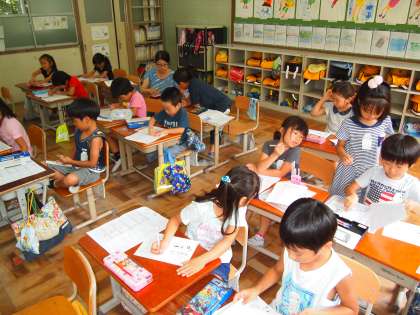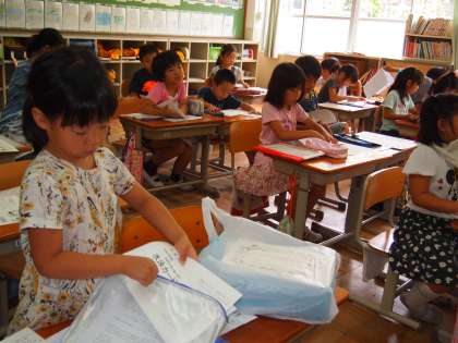 1年2組では子どもらが明日から始まる水泳で使う「水泳カード」の使い方を教えてもらっていました。きっとたくさん来てくれることでしょう。