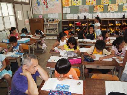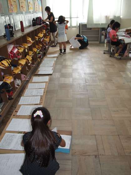 3年1組です。明日からの夏休みの宿題プリントを作っています。「私からのプレゼントです」と先生はおっしゃっていました。