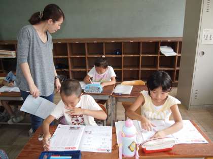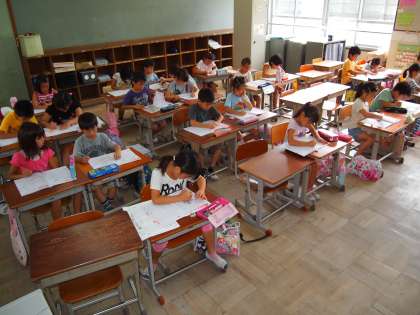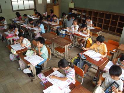 2年2組です。クーラーの効いた部屋で集中しています。