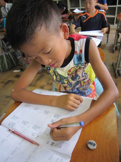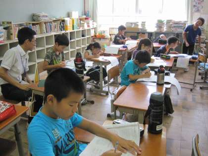 4年2組では,暑い中集まった子ども達が,ドリルやプリントに取り組んでいました。