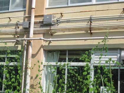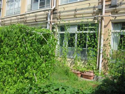 北校舎の南にある緑のカーテンがぐんぐん伸びています。