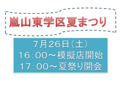 あす7月26日は,嵐山東学区夏まつりが,嵐山東小学校を会場にして行われます。
