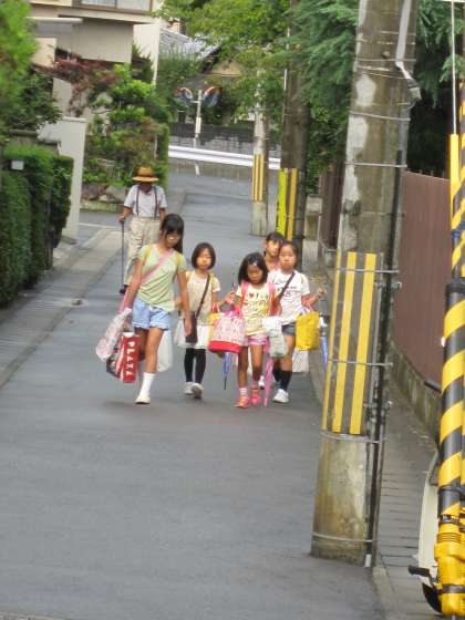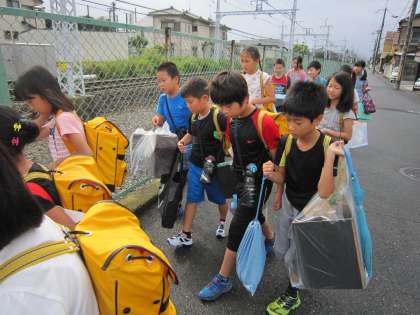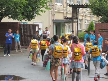 子ども達は手に夏休みの作品を持ち,見守り隊や保護者の皆さんを一緒に久しぶりに登校してきました。