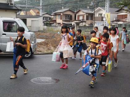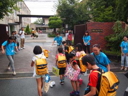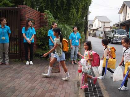 さぁ学校が始まりました。子どもたちが登校してきました。今日から1週間は「あいさつ運動週間」です。PTA本部役員さんが勢ぞろいで正門に立っていただきました。