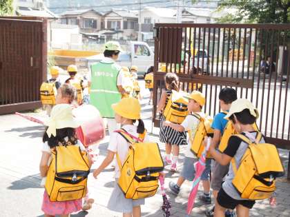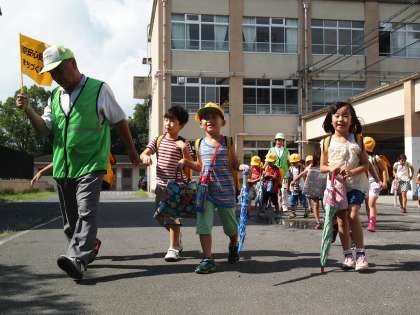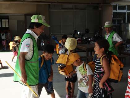 夏休み初日が終わりました。1年生が見守り隊の方と帰る時間です。一人一人の表情を見ていると笑顔がこぼれていました。きっと楽しいスタートが切れたのでしょうね。明日も元気で登校しようね。「さようなら」