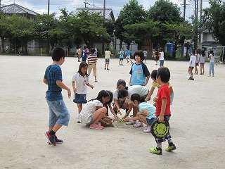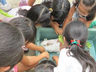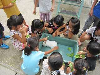 低学年の子ども達を中心に,うさぎに手に持ったキャベツを食べさせていました。