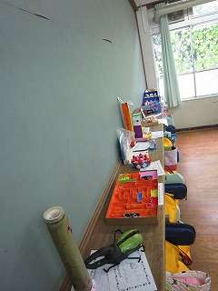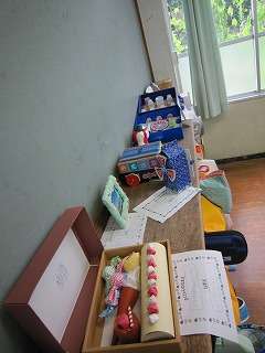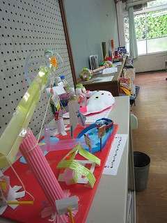 夏休みに子ども達はいろいろな作品を作っていました。1年1組では教室の後ろに,子ども達に作品が飾られていました。