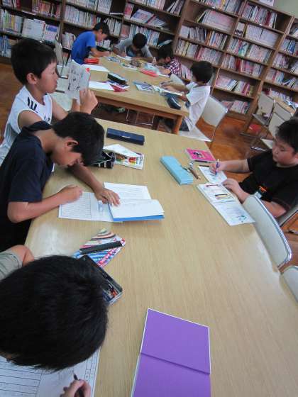 中に入ると,5年1組の子ども達が黙々と読書絵はがきをかいていました。