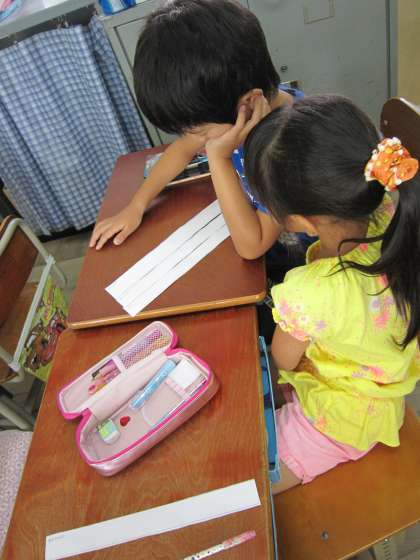 3つとは,できること(しくみ)・わけ・色形などの特徴です。子ども達は,この3つを別々のカードに書いて,どういう順番で話そうかと考えていました。