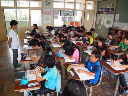 5年2組は算数の「三角形の合同」の答え合わせです。対応する角や辺を慎重にみつけていきます。