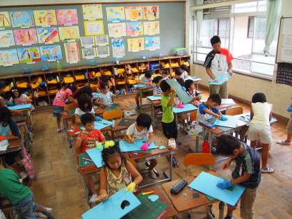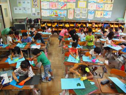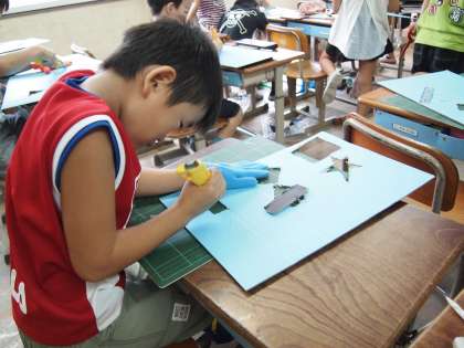 2年1組では「光のプレゼント」というものをやっていました。ひかりとかげのおもしろさを楽しみながら作っていきます。ダンボールに色画用紙を貼り付け,いろんな形にカッターナイフで切っていきます。そこへ色のセロファンを貼り付けるというものです。