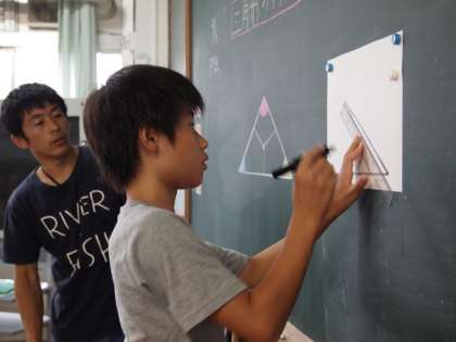 5年2組です。「三角形の角のきまりを見つけよう」という課題にトライしています。黒板に線を引いたりするのはなかなか難しいですね。