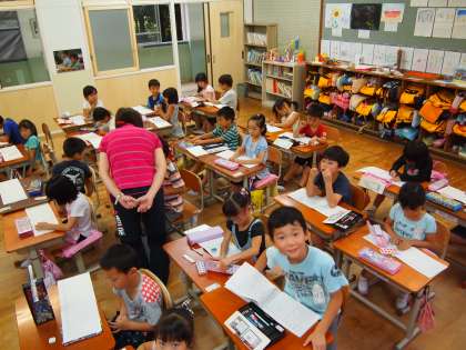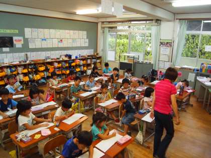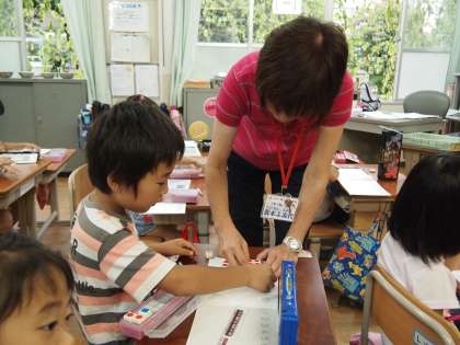 1年1組も算数の時間です。「15このおかしがあります。3こたべるとのこりはなんこでしょう?」などという問題が黒板に書かれていました。「ひき算」の考え方をしっかり身につけてほしいですね。