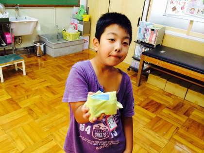 最近,ハンカチを持っている児童が少なくなりました。今日も朝から2人に保冷剤を貸し出しましたが,残念ながらハンカチは持っておらず,保健室特製袋に入れて貸し出しました。3人目の来室…,いつものように「ハンカチ持ってる?」と聞くと,ポケットからアイロンがきいたハンカチを差し出してくれました。「久しぶりに感動!!」と言いながらカメラを向けました。