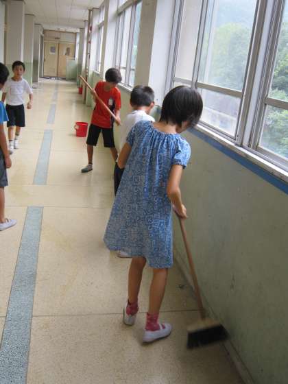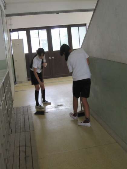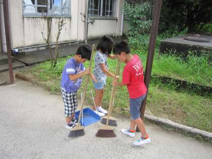 丁寧にほうきで掃く子ども達がいました。