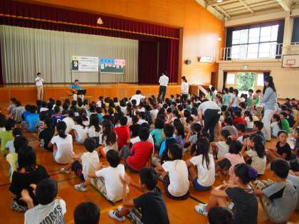 ギターのパフォーマンスで体育館に集まる子どもたちを迎えます。前回より教務主任の稲本先生が始めたことですが,今回は坂本九ちゃんの『上を向いて歩こう』です。手拍子をしてくれる子もいていい雰囲気で「きらめきタイム」が始められました。