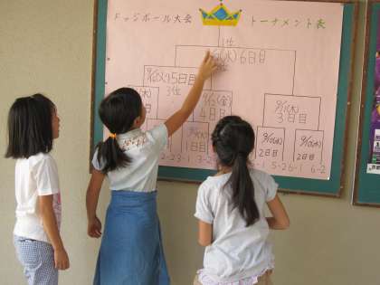 体育館横の掲示板に対戦トーナメント表が掲示されています。見ていた子ども達の指先を見ていると,「ここまで来たら優勝だね。」と話しているように思えました。