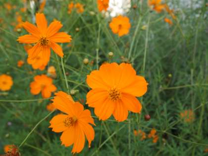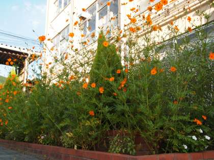 学校園ではキバナコスモスが咲き乱れています。中には2メートルを超す背丈のものもあり驚かされます。