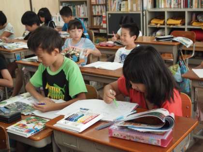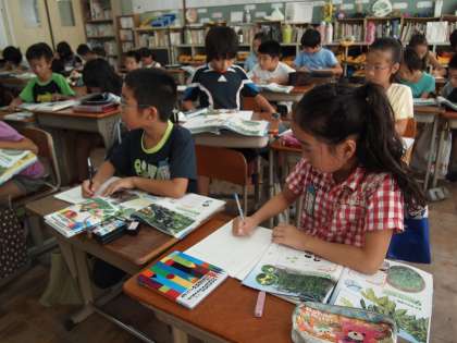 4年2組です。ツルレイシ(ゴーヤ)の成長をノートに記録しているところでした。